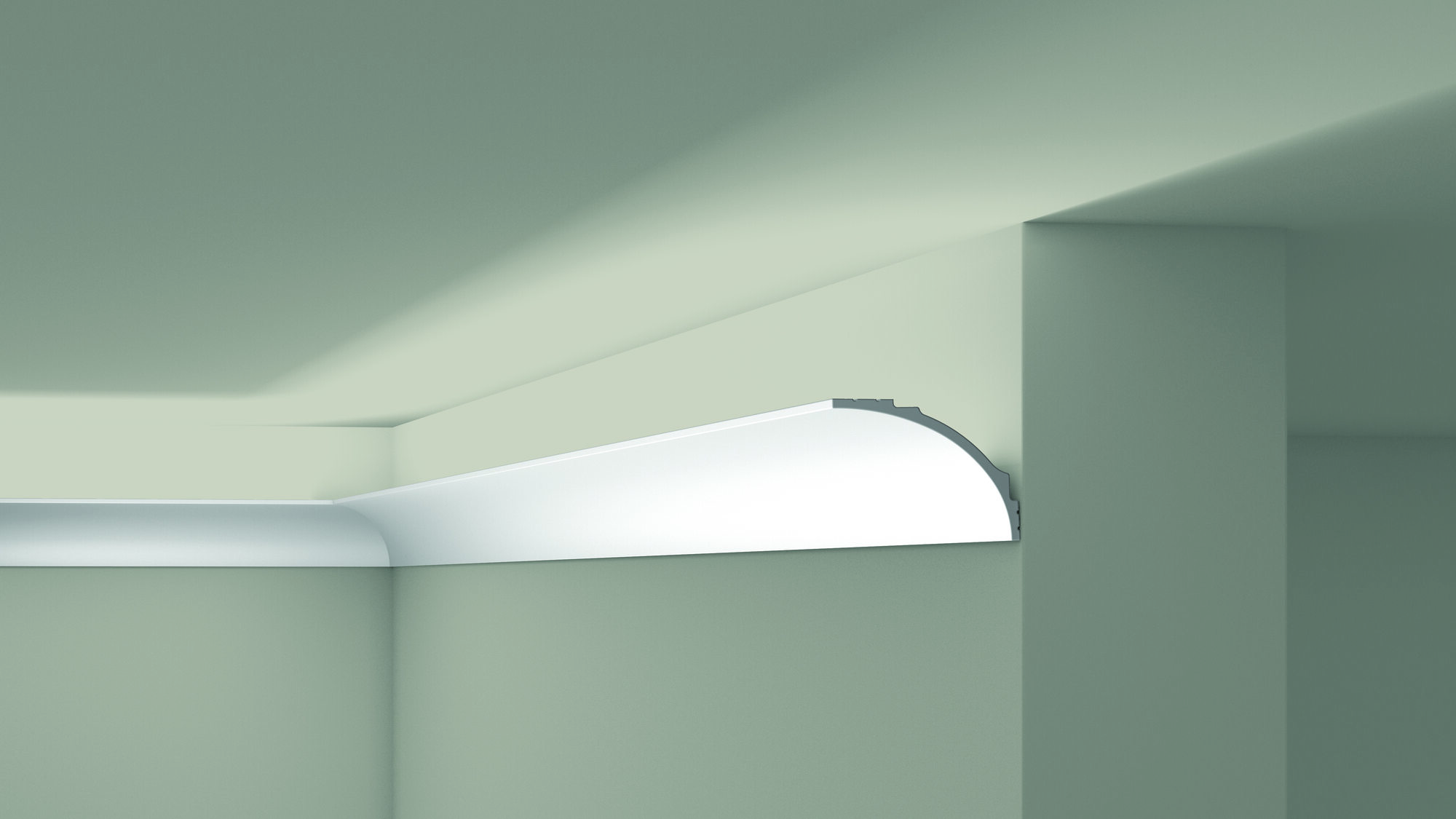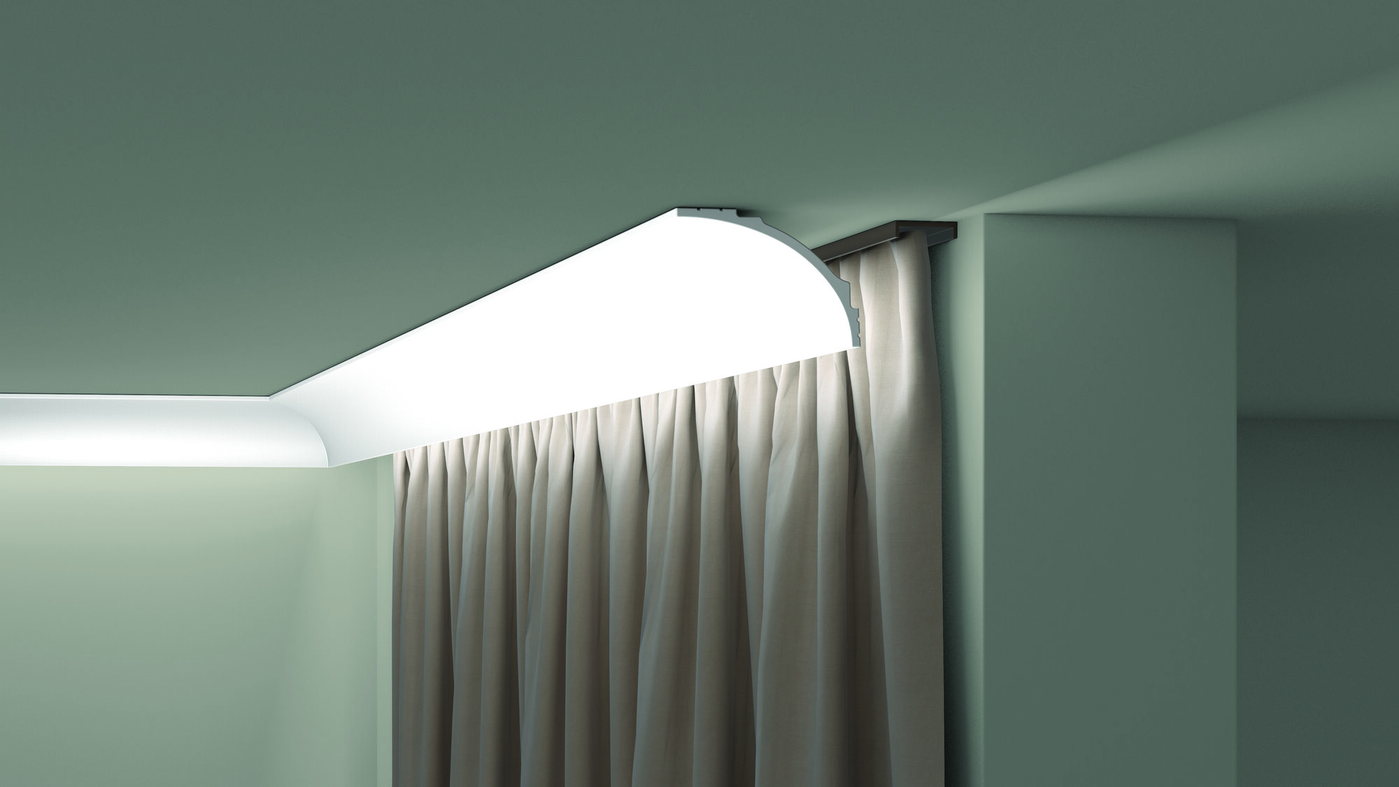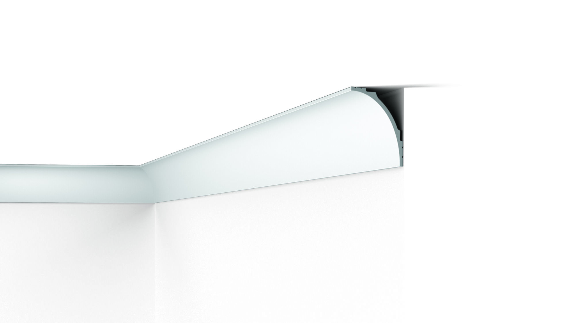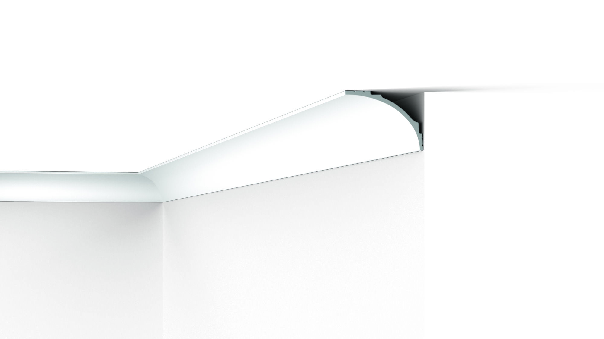 Dekoracyjna listwa przysufitowa przeznaczona do zastosowania jako element montażu lub ukierunkowania oświetlenia LED. Tył listwy posiada powłokę zabezpieczającą przed przenikaniem światła. Model ten sprawdzi się również jako maskownica szyny karniszowej.