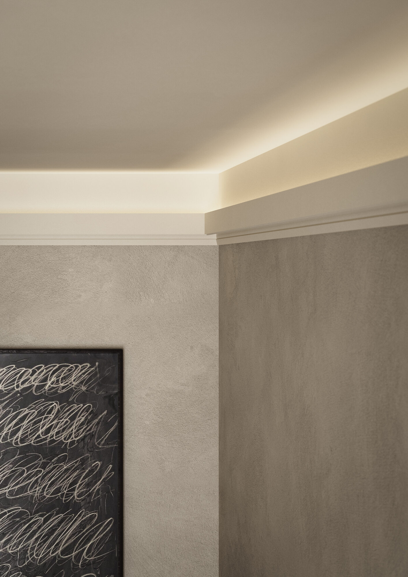 Dekoracyjna listwa przysufitowa przeznaczona do zastosowania jako element montażu lub ukierunkowania oświetlenia LED.