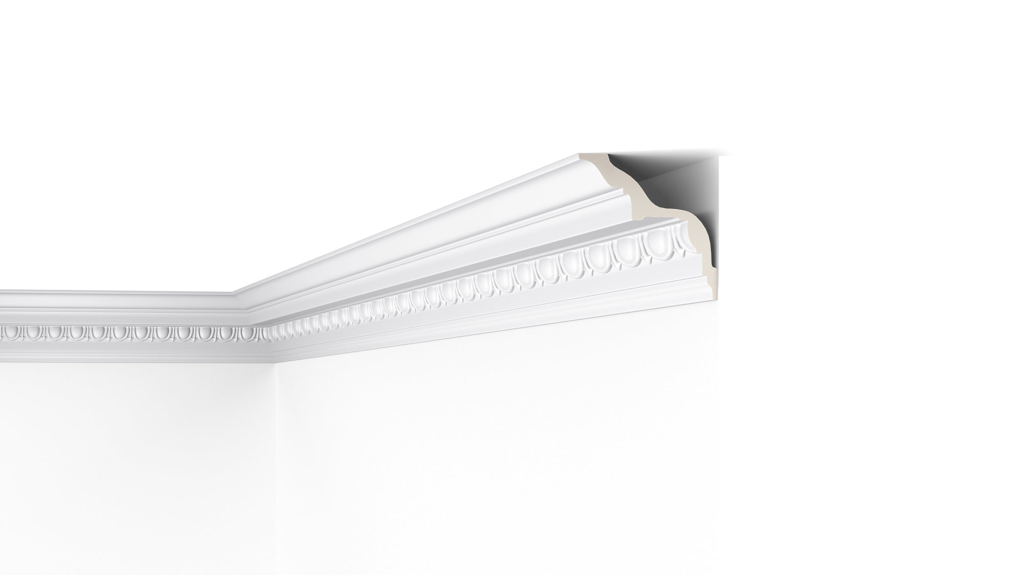 Bogato zdobiona listwa przysufitowa wykonana z wysokiej jakości materiału pozwoli dodać elegancji i charakteru zarówno klasycznym jak i nowoczesnym wnętrzom. Wykonana z dbałością o szczegóły, niezwykle łatwa w montażu pomoże ukryć drobne niedoskonałości na styku ścian i sufitu.