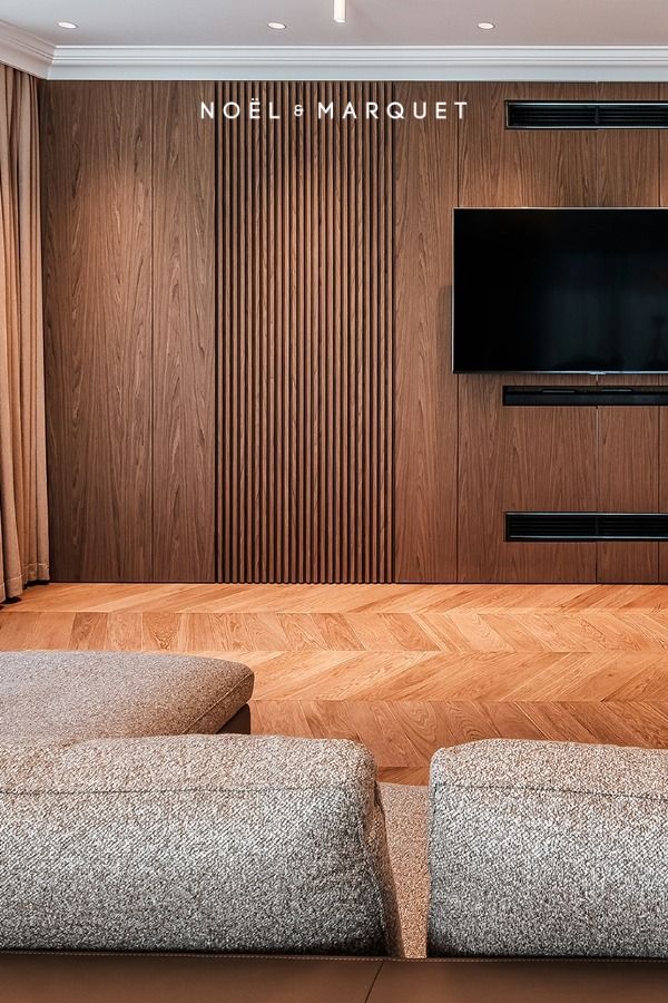 Sztukateria może delikatnie wyznaczać strefy funkcjonalne, bez budowania fizycznych ścian. Panele ścienne , ramy lub listwy w innym kolorze pozwalają optycznie oddzielić np. strefę pracy od wypoczynku. To sposób na organizację przestrzeni z klasą. Poniżej przykład zastosowania różnych paneli ściennych w strefie kanapy i poza nią.