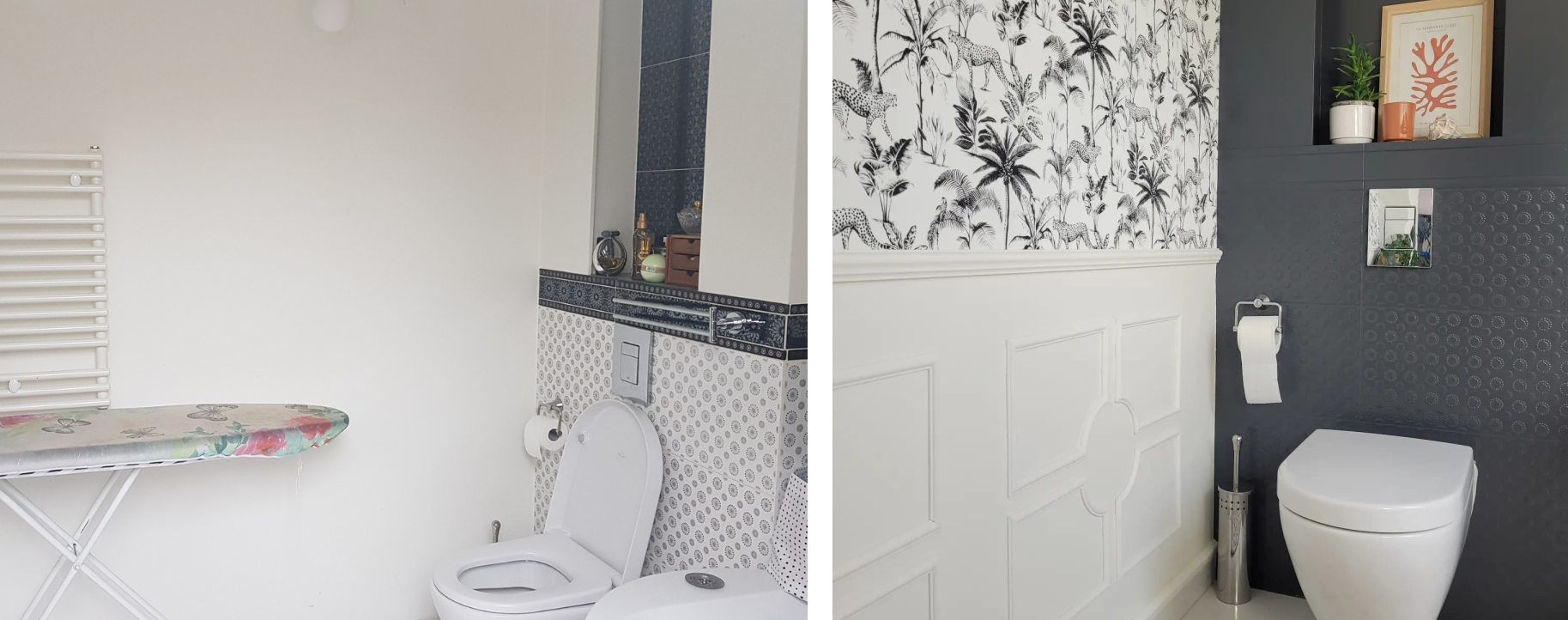 Doskonały pomysł na dodanie przytulności zimnej łazience: na dolnej części ściany lamperia wykonana z listew sztukateryjnych, a and nią tapeta. Akcenty ze sztukaterii wniosły do tego zimnego wnętrza element salonowy. Małgosia chcąc przełamać typowy układ listew w tzw. ramkę, sięgnęła po narożniki, które dla oryginalnego efektu ułożyła w koło. Lamperia to świty pomysł na dekorację ściany także w sypialni, przedpokoju czy kuchni. Do jej wykonania możesz użyć różnego rodzaju listew oraz pomalować je na wybrany kolor.